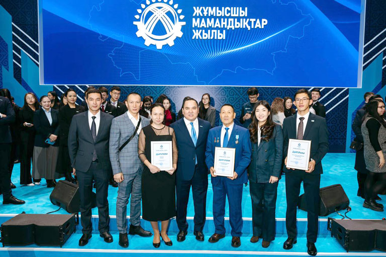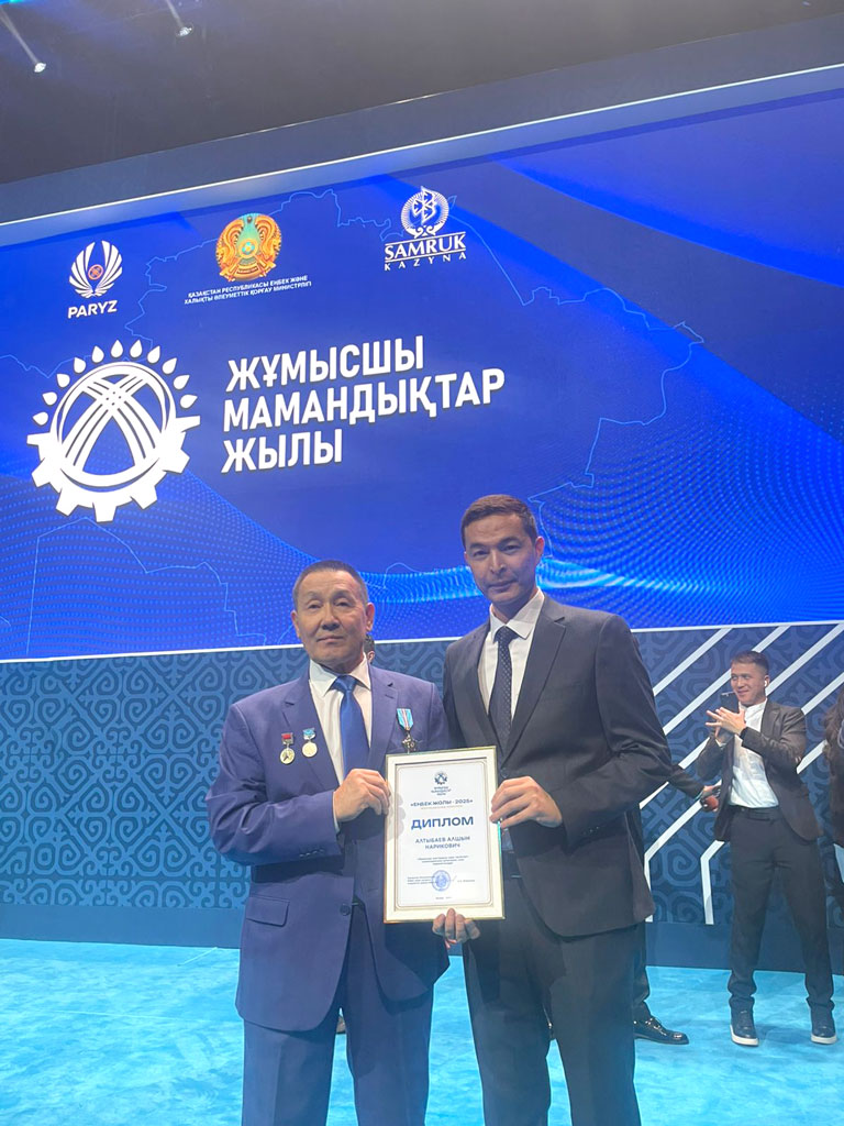 Министр труда и социальной защиты населения Республики Казахстан Жақыпова Светлана Қабыкеновна вручила Диплом республиканского конкурса «Енбек жолы-2025» Алтыбаеву Алшыну Нариковичу за его вклад в воспитание молодежи в духе уважительного отношения к труду, привлечения их в сферу производства и пропаганде рабочих профессий.